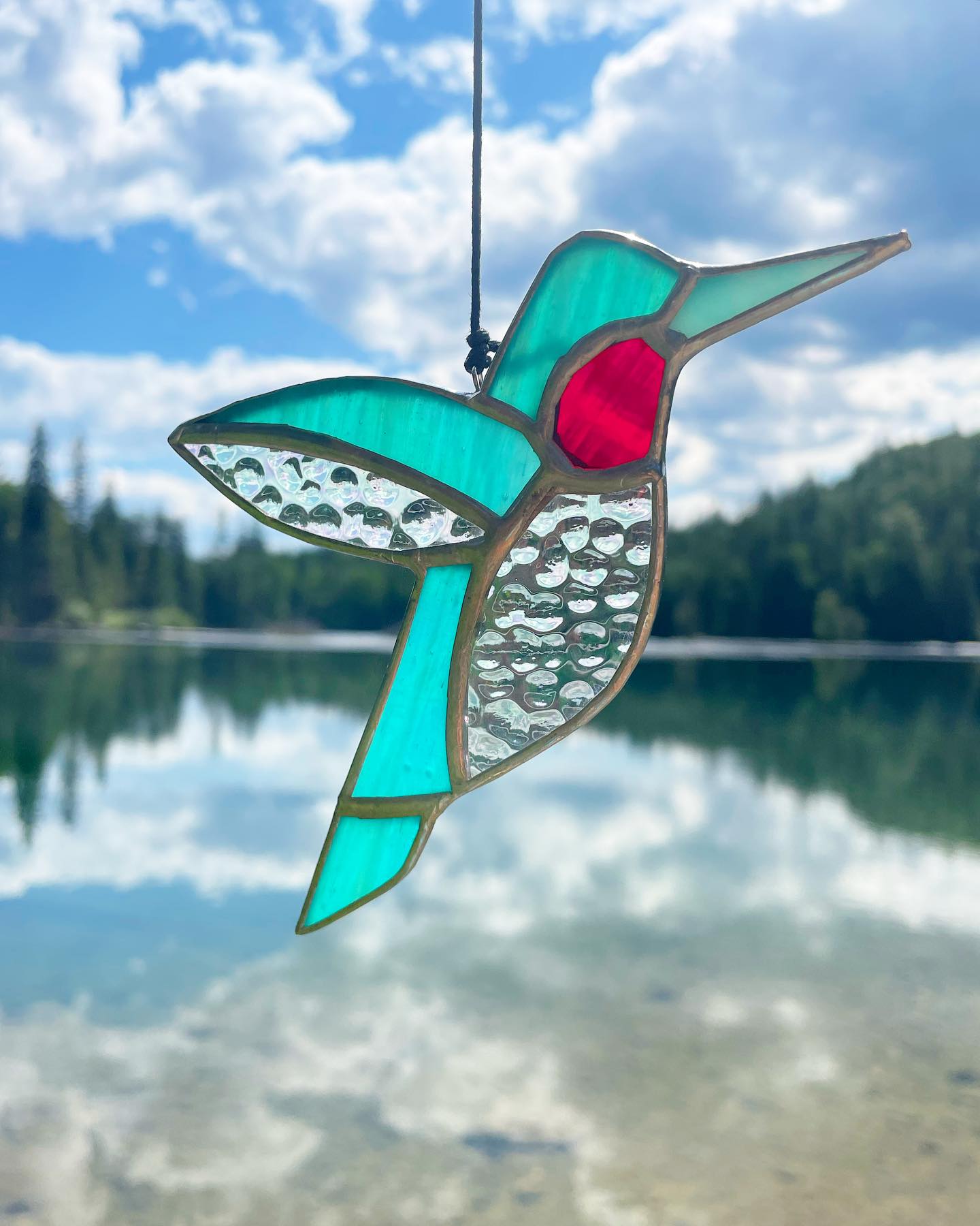 Each hummingbird is handcrafted using the traditional copper foil technique. It measures approximately 4.5" x 4.5" and is wrapped with black waxed cord for hanging.