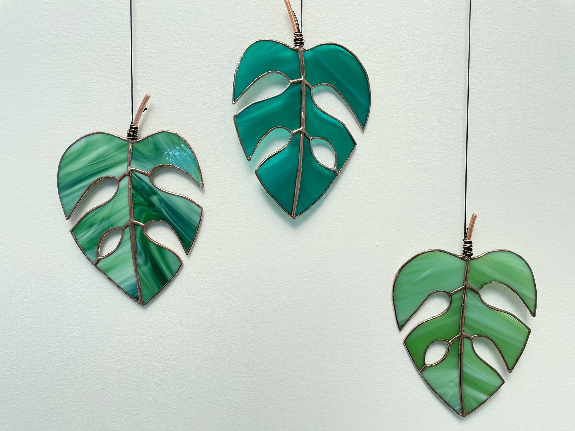 Each monstera leaf is handcrafted using the traditional copper foil technique. A copper patina has been applied and the piece has been finished with polish. It measures approximately 5.5"x 7" and is wrapped with black waxed cord for hanging.